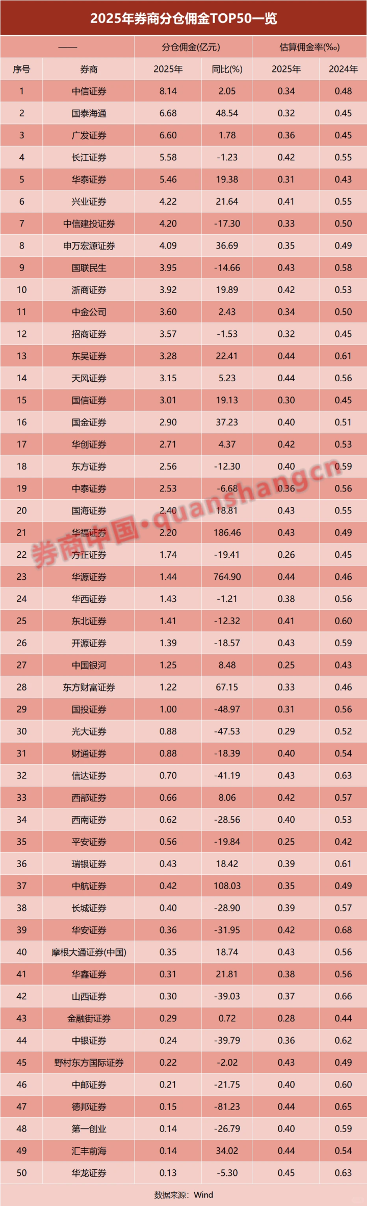 券商中国统计的2025年券商分仓佣金top50一览,其中中信证券8.14亿,高居第一,遥遥杰出,国泰海通,广发证券位居2和3,开云sports收支不大。
