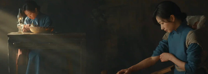 蓝布长衫、白内搭,旧旧的布料,猖獗的发型,好意思满还原了民国期间底层庸东说念主物的容颜。