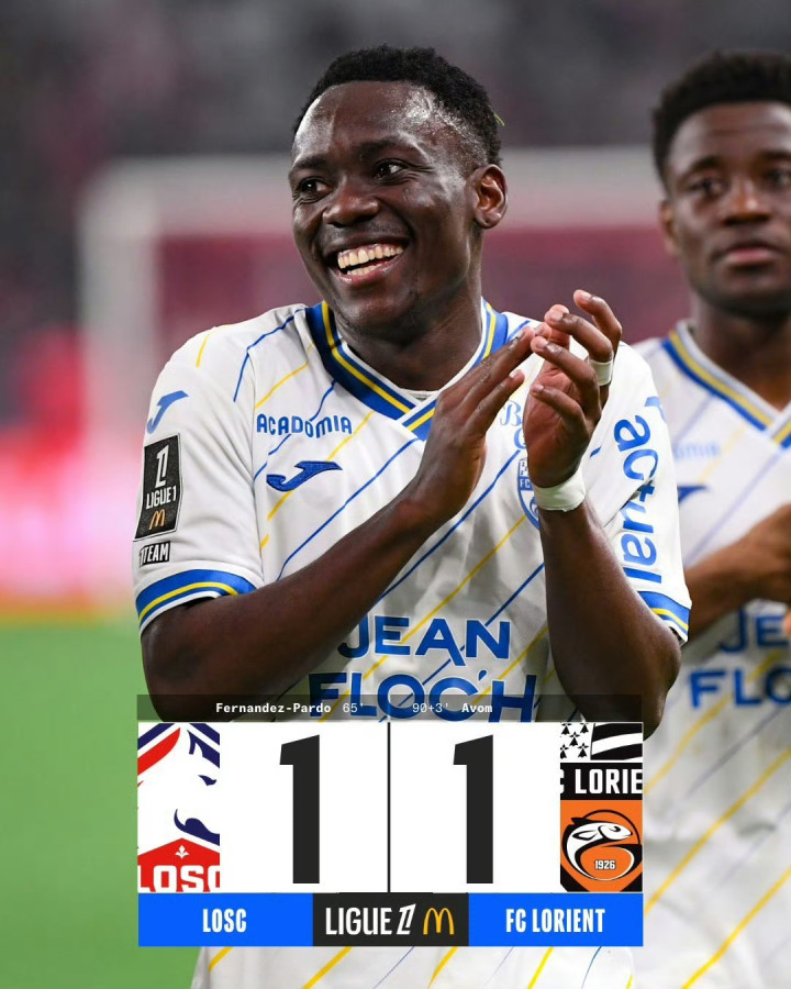 全场补时第3分钟,阿蒂尔·埃邦破门,里尔1-1战平洛里昂。
