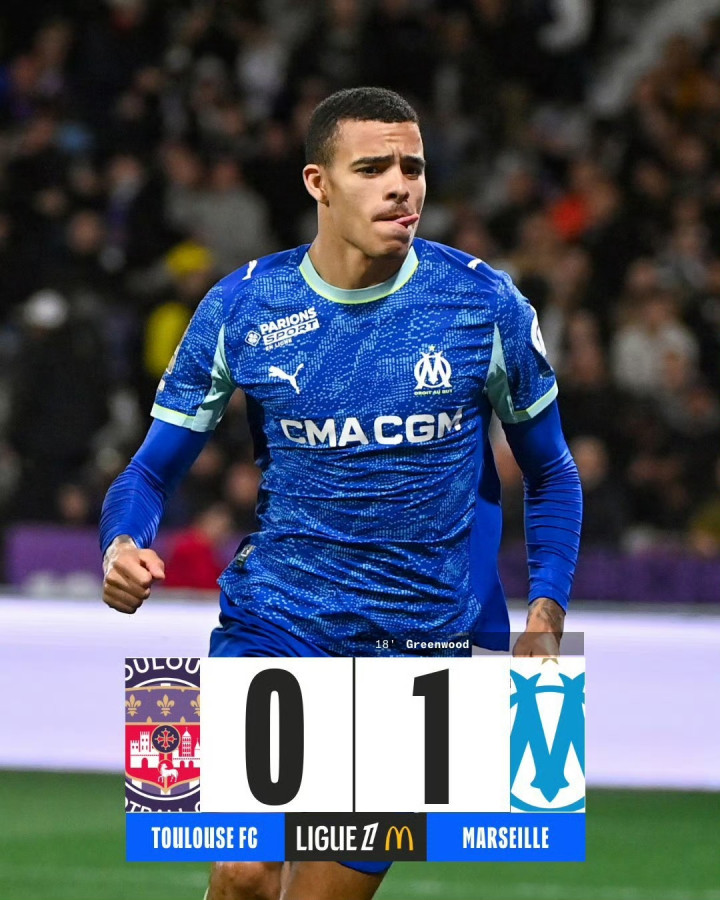 第18分钟,派尚倒三角传球,格林伍德拍马赶到劲射破门,马赛1-0礼服图卢兹。