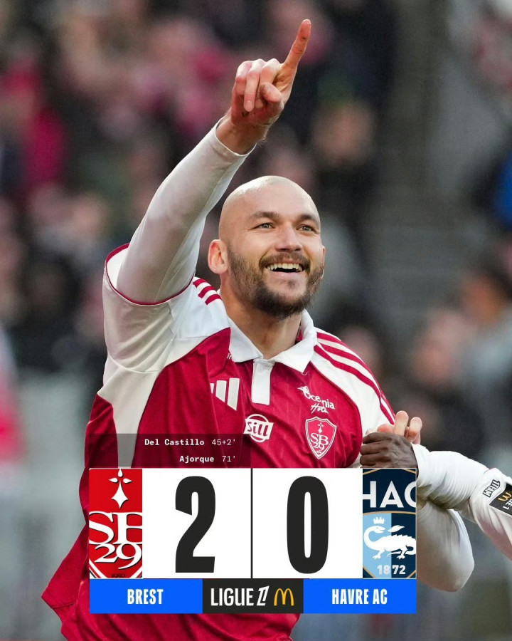 上半场补时第2分钟,肯尼·拉拉助攻德尔卡斯蒂略破门,布雷斯特1-0跳动勒阿弗尔。