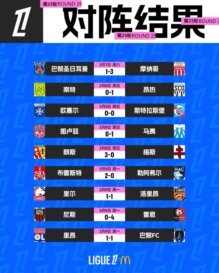2025/26赛季法甲联赛第25轮当天凌晨战罢。摩纳哥3-1客胜巴黎圣日耳曼,朗斯3-0完胜梅斯,马赛1-0小胜图卢兹,洛里昂1-1绝平里尔,里昂1-1战平巴黎FC,雷恩4-0横扫尼斯。