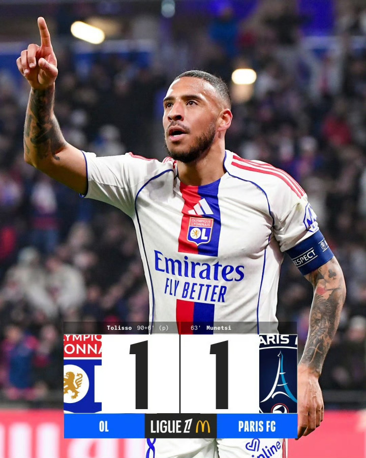 全场补时第6分钟,托利索罚入点球,里昂1-1战平巴黎FC。