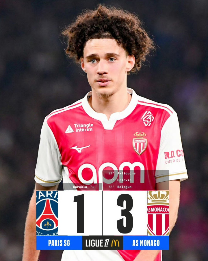第27分钟,阿克利乌什禁区迎球抽射近角破门,巴黎圣日耳曼0-1过期摩纳哥。