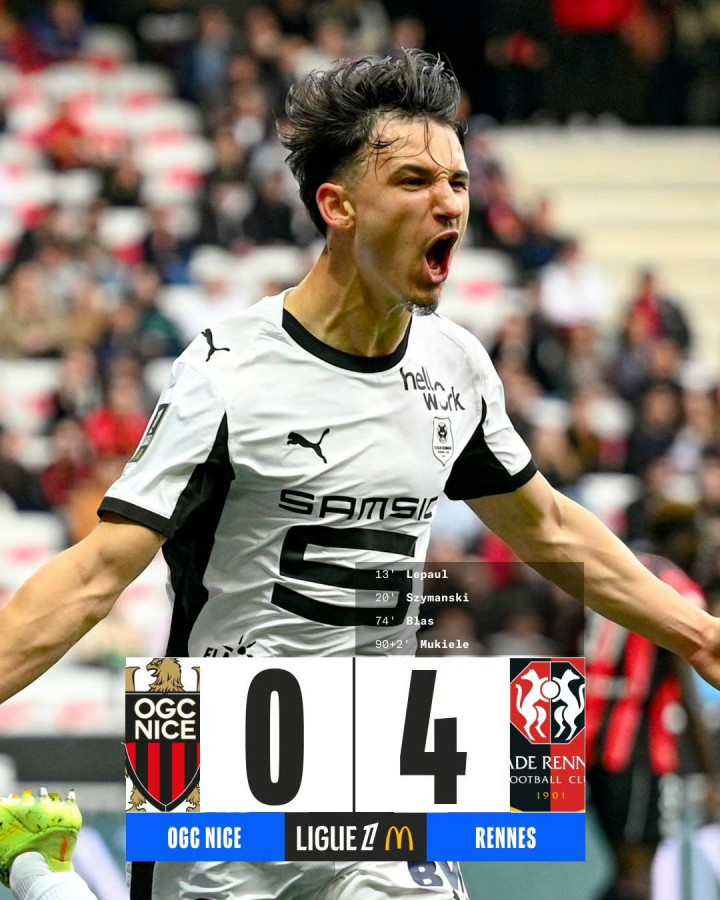 第74分钟,恩博洛助攻卢多维奇·布拉斯破门,尼斯0-3过期雷恩。