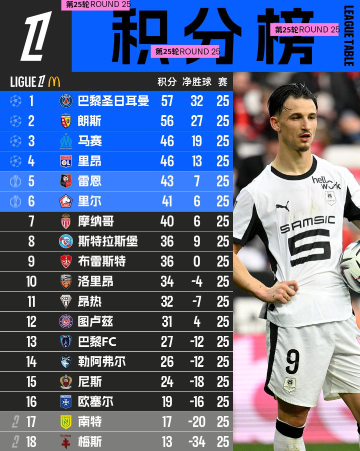 积分榜方面,巴黎圣日耳曼以57分领跑积分榜,朗斯、马赛和里昂分居第二、三、四位,南特和梅斯暂时位于左迁区。