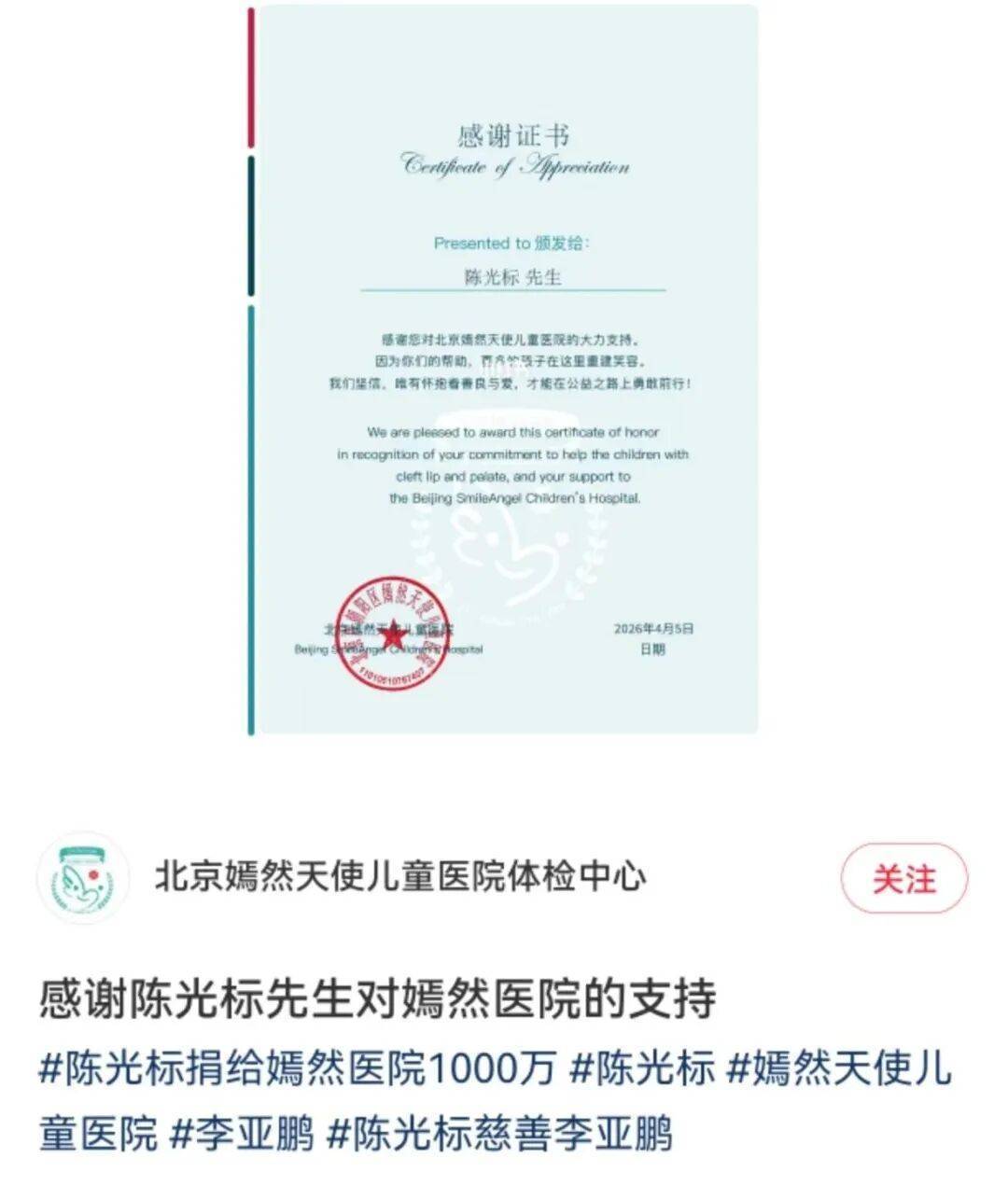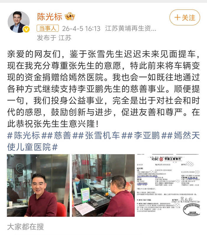 4月10日,嫣然天神儿童病院首创东谈主李亚鹏在直播中带来重磅音讯:陈光标捐赠的1000万元善款已证实到账。这位曾因高调慈善激励争议的企业家,这次用内容步履修起了所有质疑——汇款字据明晰显现资金已投入病院专用账户,而更让东谈主偶而的是,这笔巨款竟莫得任何使用驱散。李亚鹏在镜头前反复强调:“标哥真金白银捐了1000万,具体怎么花,病院会按内容需求安排。”