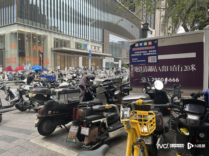 以宝安区坪洲地铁站为例,该站背靠宝安大仟里购物中心,平时东说念主流车流高度密集。4月20日上昼11时许,记者回拜现场看到,区域内虽竖立了播送指示和分区停放指令牌,明确P1为非天真车临时停放区、满位后可赶赴P2区域,也预留了单东说念主通行收支口,但因未联接客流潮汐规章、市民出举止线作念雅致化分区与动线疏通,电动自行车依然扎堆停放,市民只可在车群中“挨风缉缝”穿行。
