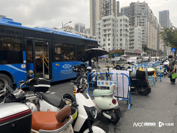 在龙华东说念主民病院门口,电动自行车就医停放需求严重迷漫,联系部门虽在病院门前的公交站旁划出了一小块停放区域,但该区域径直占用了一条天真车说念,导致底本只消三条车说念的景龙成立路通行智力进一步下落,加重了路段拥挤。