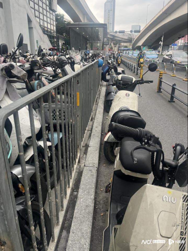 布心性铁站A口外,盲说念已成为电动自行车停放范围。
