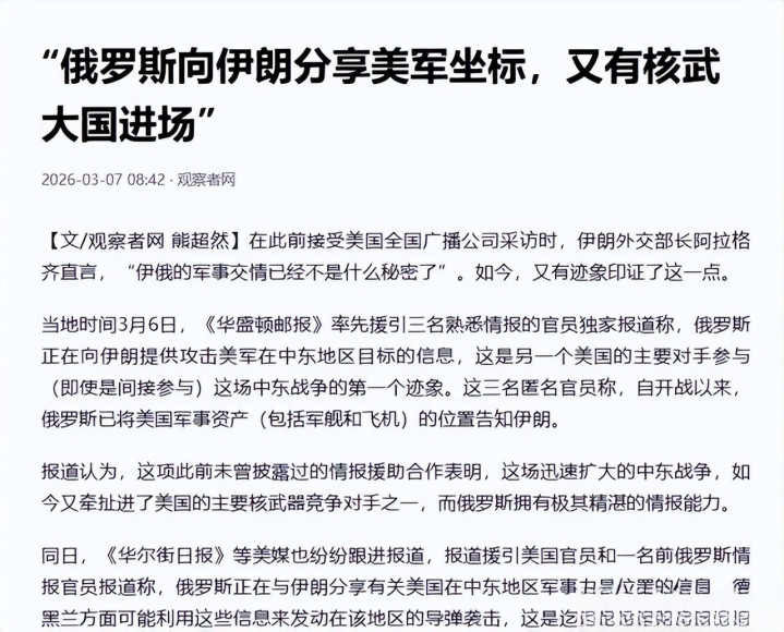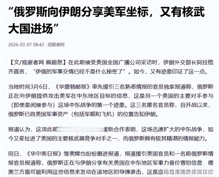这里的关节在于,俄罗斯并未径直发兵,而是通过谍报输出这种“低烈度介入”表情,既掩饰了与好意思国径直冲突的风险,又能实质性进步伊朗的反击才调,这种“代理东说念主博弈”的手法,比径直参战更具政策威慑力。