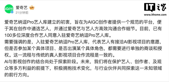 IT之家提防到,爱奇艺官微发文示意,入驻爱奇艺纳逗Pro艺东谈主库,代表艺东谈主有扣问AI影视项指标意愿,然而否参预某个具体方式、是否出演某个具体扮装,皆需要进行单独的商谈和授权。这已经过与传统的真东谈主影视方式合营经过是一致的。