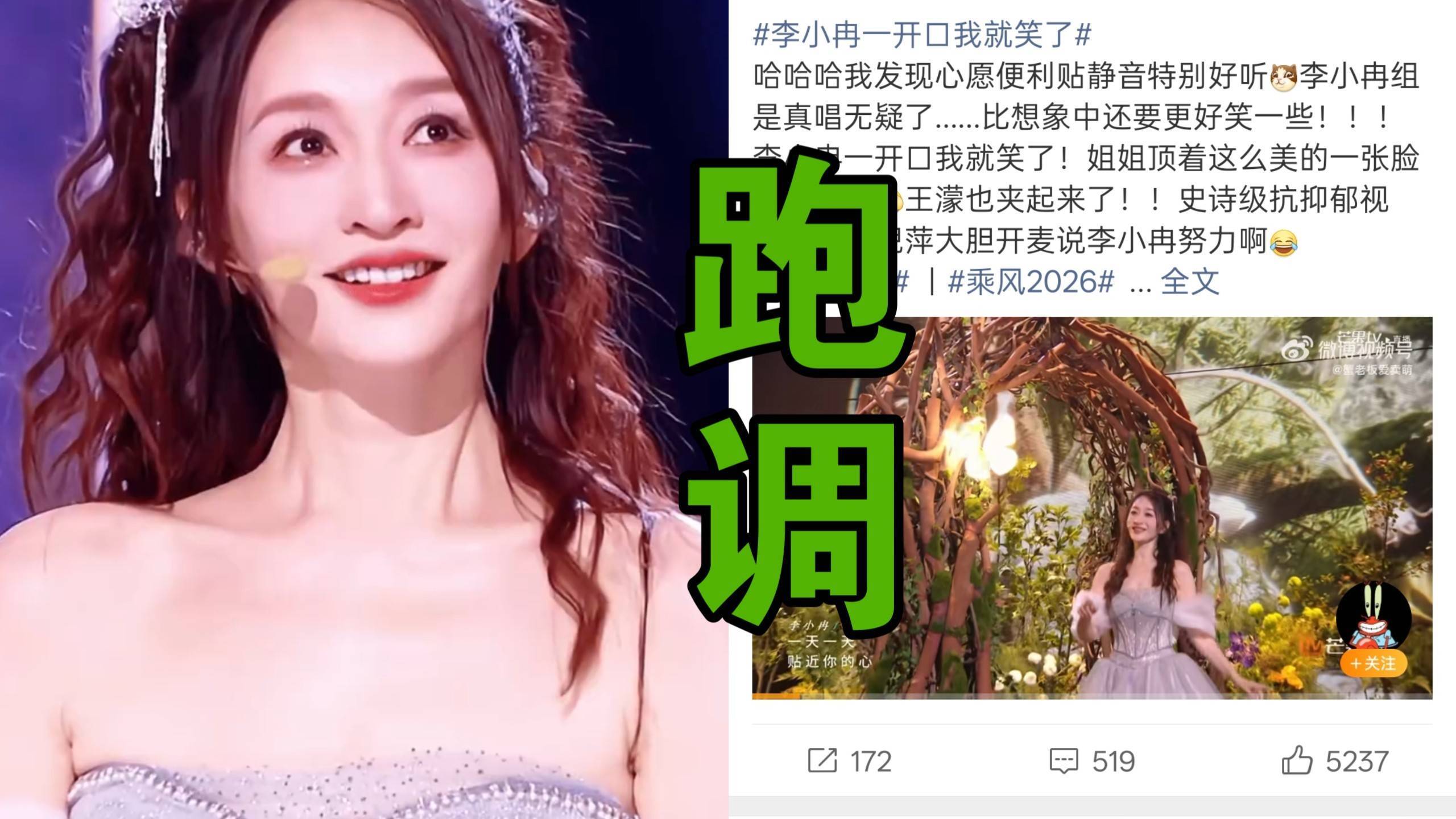 谁能念念到50岁的李小冉会靠跑调火出圈?《乘风2026》一公小考直播里,她带着王蒙和唐艺昕把甜歌《心愿便利贴》唱成了大型“车祸现场”——高音上不去、节拍踩不准,三个东说念主各唱各的调,网友簸弄“版权费白花了,这首歌跟原曲莫得任何血统干系”。更绝的是饰演法例后,她对着镜头快言快语“有黑幕吧”,鲠直秉性骤然圈粉,#李小冉跑调#话题阅读量一天内径直破亿。作为北舞毕业的专科舞者,她在初舞台衣服黑裙亮相时,冷白皮在聚光灯下白到发光,507分拿下等二名,冻龄气象让网友惊叹“说25岁我皆信”。可到了唱跳要领,这位演技派大花却通晓了五音不全的短板,记歌词记成“含笑便利店”,还得靠在手臂写满歌词当提词器。